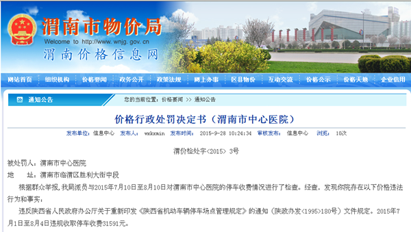 9月28日上午,渭南市物價局在其官網刊出對于渭南市中心醫(yī)院的價格行政處罰決定書。其中提到,市物價局于2015年7月1日—8月4日對渭南市中心醫(yī)院的停車收費情況進行了檢查。經查,渭南市中心醫(yī)院確違反《陜西省機動車輛停車場點管理規(guī)定》的通知(陜政辦發(fā)<1995>180號)相關規(guī)定,違規(guī)收取停車費屬實。
