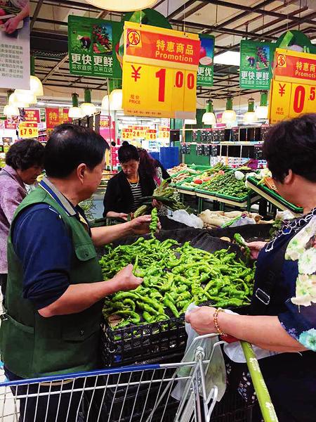菜價降了,某超市里1元、0.5元的蔬菜引來不少市民選購。