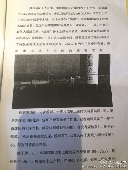 神木縣煤炭局地稅局,我叫徐光榮,現(xiàn)在實名舉報神木縣聚隆煤礦偷稅漏稅。陜西省榆林市神木縣聚隆煤礦疑似偷稅漏稅,非法出售“黑煤”。公開資料顯示:神木聚隆煤礦位于神木縣北西方向29km處,行政區(qū)隸屬神木縣孫家岔鄉(xiāng)管轄,由原四個相鄰小煤礦及周邊零星井田整合后劃定。經(jīng)陜西省國土資源廳批復(fù)的保有地質(zhì)儲量為4214。7萬噸,可采儲量2334.2萬噸,設(shè)計生產(chǎn)能力為60萬噸/年,服務(wù)年限為27.9年。記者一行來到神木縣多部門了解核實,去該礦對工人及聚隆當(dāng)?shù)厝罕娏私?,該礦所生產(chǎn)的絕大部分煤都不上稅,當(dāng)?shù)厝朔Q為“黑煤”,這些黑煤由張子勝等人組織發(fā)售。拉煤車在聚隆煤礦裝滿煤后,只收錢,不出票,由張子勝等人通過關(guān)系,“逃避”神木縣煤檢站檢查,而神木縣煤檢站也是形同虛設(shè),順利通過并且護送上高速公路。記者通過多方途徑尋找所謂的關(guān)系,但是工人們對此諱莫如深。該礦礦長為張子勝全權(quán)負責(zé)。在聚隆煤礦,記者看到幾十輛拉煤車正在排隊等著裝煤,可以聽見轟隆隆地機械聲,煤礦正在緊張生產(chǎn)作業(yè)。記者隨機采訪了一輛河南牌照的大車司機,問及這車煤拉往何地?有沒有煤檢票時,他告訴記者,“給河南那邊拉的煤,沒有票”。記者又問了旁邊幾輛拉煤車司機,得到回答都沒有票,隨后又來到開票處,其工作人員講“不開票110元,開票是160元”。據(jù)了解,2011年每噸煤須要上繳的各種稅費在100元左右,現(xiàn)在是50~60元,按照每個生產(chǎn)日生產(chǎn)4000多噸煤,每噸上繳稅費50元,每年生產(chǎn)300天來計算,一年的偷稅漏稅最少要6000萬元,從2011年到現(xiàn)在,偷稅漏稅的錢數(shù)將達2.4億元之巨,數(shù)額驚人!這些錢都進了誰的腰包?此前已有媒體對神木聚隆煤礦私放“黑煤”進行了報道,但是神木相關(guān)部門一直沒有對該礦進行查處。足見神木聚隆煤礦和該礦礦長張子勝能量巨大。另外該礦在生產(chǎn)過程中,嚴(yán)重威脅到附近村民的生存環(huán)境。2015年4月份在未經(jīng)當(dāng)?shù)卮迕裢庀?,私自拆除雷光斌等村民的房屋。已被神木縣治安大隊立案,但遲遲未被查處。當(dāng)?shù)鼐用褚蓡?,聚隆煤礦能如此瘋狂地偷稅漏稅,是否跟煤炭監(jiān)管部門有利益關(guān)系?與當(dāng)?shù)卮迕癜l(fā)生糾紛后為什么遲遲沒有被查處,煤礦仍然照常生產(chǎn)。到底誰是聚隆煤礦和張子勝的保護傘?