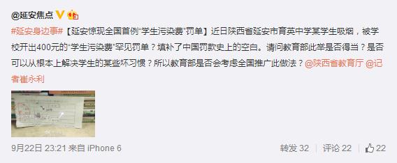 近日陜西省延安市育英中學(xué)某學(xué)生吸煙,被學(xué)校開(kāi)出400元的“學(xué)生污染費(fèi)”罕見(jiàn)罰單?填補(bǔ)了中國(guó)罰款史上的空白。請(qǐng)問(wèn)教育部此舉是否得當(dāng)?是否可以從根本上解決學(xué)生的某些壞習(xí)慣?所以教育部是否會(huì)考慮全國(guó)推廣此做法?