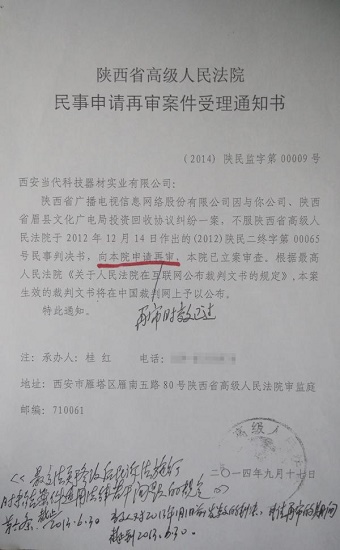 2014年9月17日,陜西高院對該案作出“民事申請?jiān)賹彴讣芾硗ㄖ獣薄T撏ㄖ獣@示,陜西廣電網(wǎng)絡(luò)公司不服陜西高院作出的終審判決,“向本院申請?jiān)賹彛驹阂蚜笇彶?。?