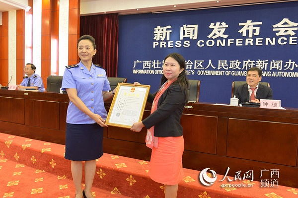圖為廣西自治區(qū)工商局局長(zhǎng)、張虹為企業(yè)主頒發(fā)廣西第一張加載全國(guó)統(tǒng)一代碼的“三證合一、一照一碼”營(yíng)業(yè)執(zhí)照(楊彪/攝)